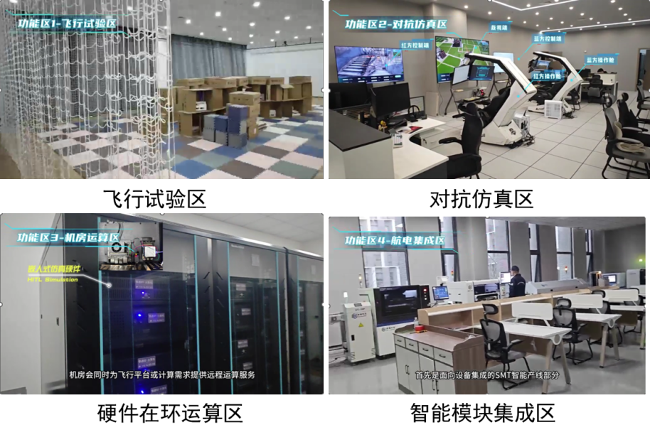该实验室以虚实结合仿真技术为核心,构建多场景试验环境。内部划分三大功能区,飞行试验区可模拟各类飞行工况与环境参数,实现飞行系统性能测试;对抗仿真区支持多主体动态对抗推演,还原复杂交互场景;专用机房则为全流程仿真提供稳定算力支撑与数据存储服务,整体形成从模拟试验到数据处理的完整闭环。